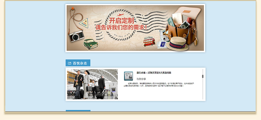 Project Description 百悦逸游于2012年初由二位资深的旅行家创办,是成都传媒集团旗下成都新闻国际旅行社有限公司的高端旅游品牌,总部位于成都高新区天府大道中段美年广场。在百悦逸游成立之前,创始团队亲自到全球三十多个国家实地考察,带着第一手的资讯和执着的信念创立了中国西部第一家真正意义上的私人定制旅行机构。百悦的旅行不是跟团挤大巴,不是十天去十个国家,更不是没完没了的... Official website address 武汉http://www.100.travel I want to share